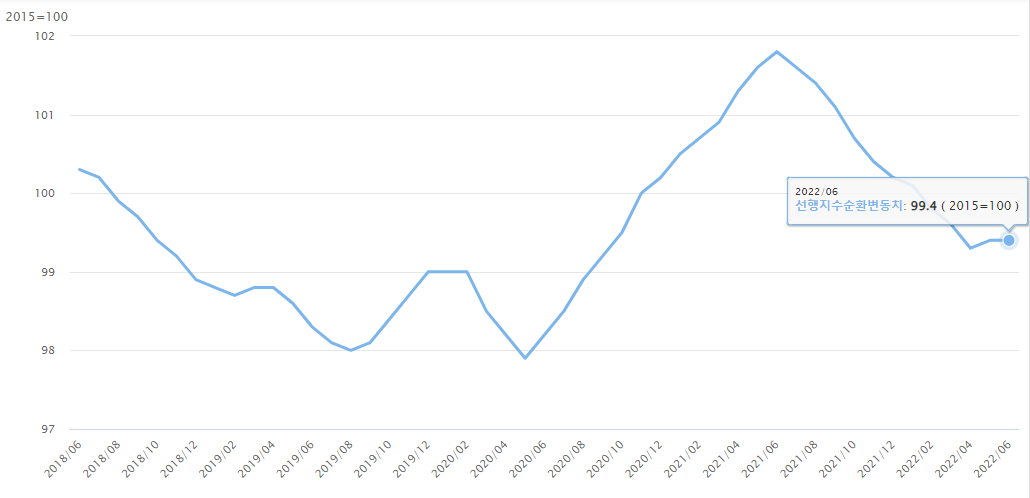 ▷ 8월 2일 발표된, 경기선행지수 순환변동치 자료이다.