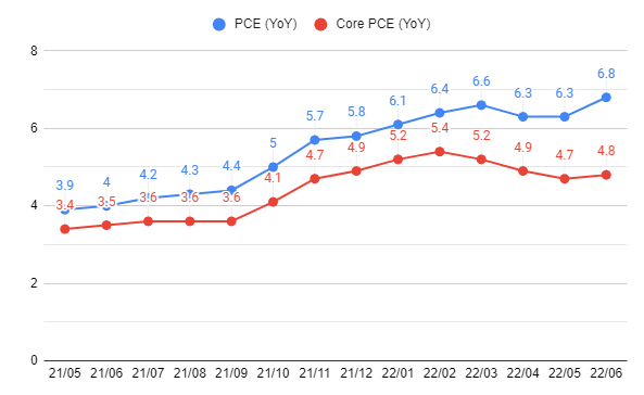 ▷ 7월 29일 발표된, 22년 6월 PCE, Core PCE의 YoY 증가율이다.