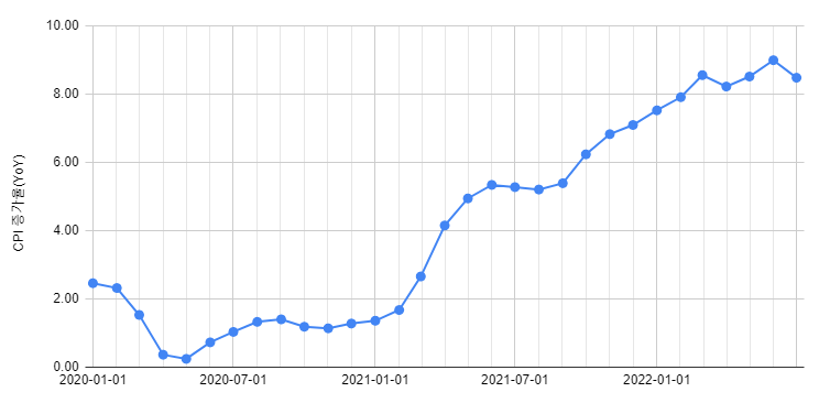 ▷ 7월 CPI 예측 컨센서스가 8.7% 상승이었는데, 발표치는 8.5% 였다. WOW!!