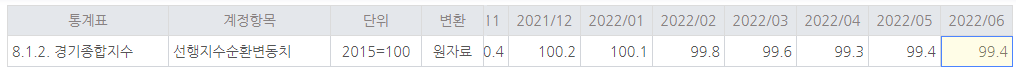 선행지수 순환변동치는 반향을 쉽게 바꾸지 않고, 방향이 바뀌면 추세를 보여주는 경향이 있는데... 지난 달과 같다는 것은 방향을 예측하기 어렵다.