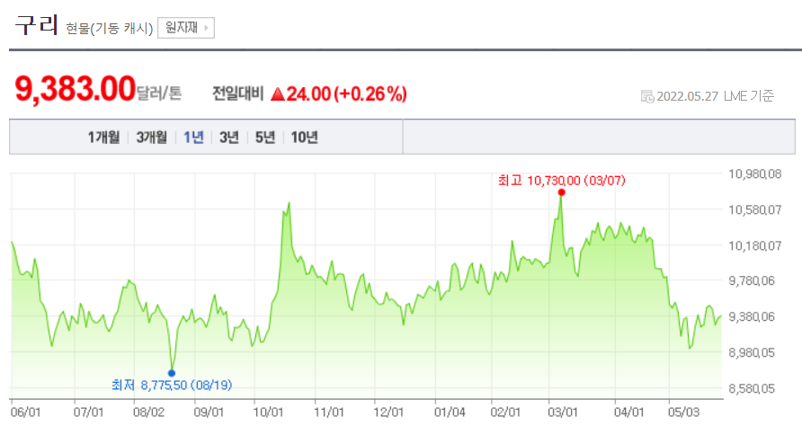 현재는 구리 가격이 급락했다가, 중국의 봉쇄 해제의 영향으로 상승하는 듯 하다. 중국 산업이 정상회 됨에 따라 구리가격은 더 올라갈 것으로 예상해본다.