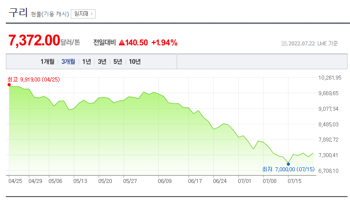 ▷ 쭉쭉 하락하던 구리 가격이 멈칫하고 있지만, 경기침체에 대한 걱정이 만연한 지금, 가격 하락추세가 상승추세로 바뀔것 같진 않다.